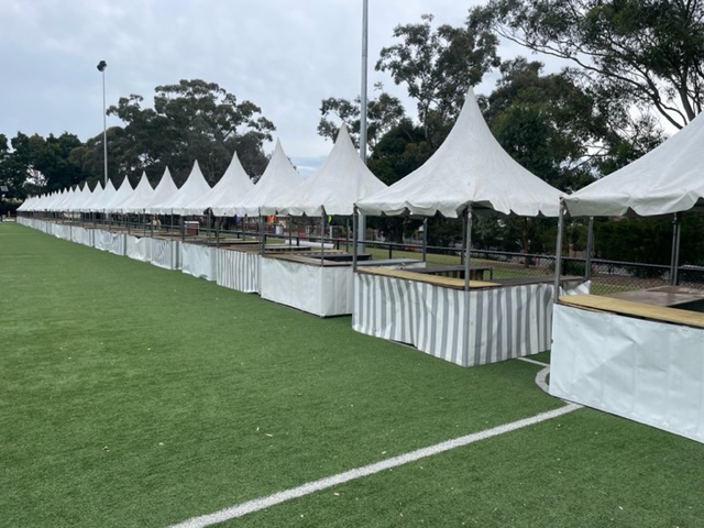 With a hi top curved roof it stands out from the crowd. Solid timber benches on 3 sides creates plenty of bench space for selling any products. Fete stalls are 2.4m x 2.4m in size and 3300mm in height.